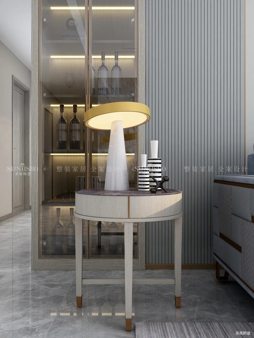 进入玄关区域就能感受到房主对时尚风格的偏爱,实木元素与简奢金属的碰撞,既有对材质的甄选,又有现代简奢的品质感。穿衣镜、换鞋凳、收纳柜等藏漏有序的分区,将屋主的生活归纳的井井有条。